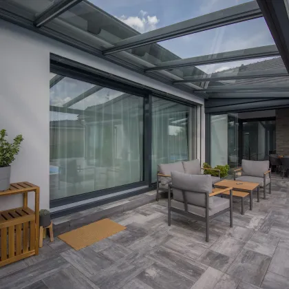 Prosklená pergola doplněná látkovými závěsy rozšiřuje prostor domu.