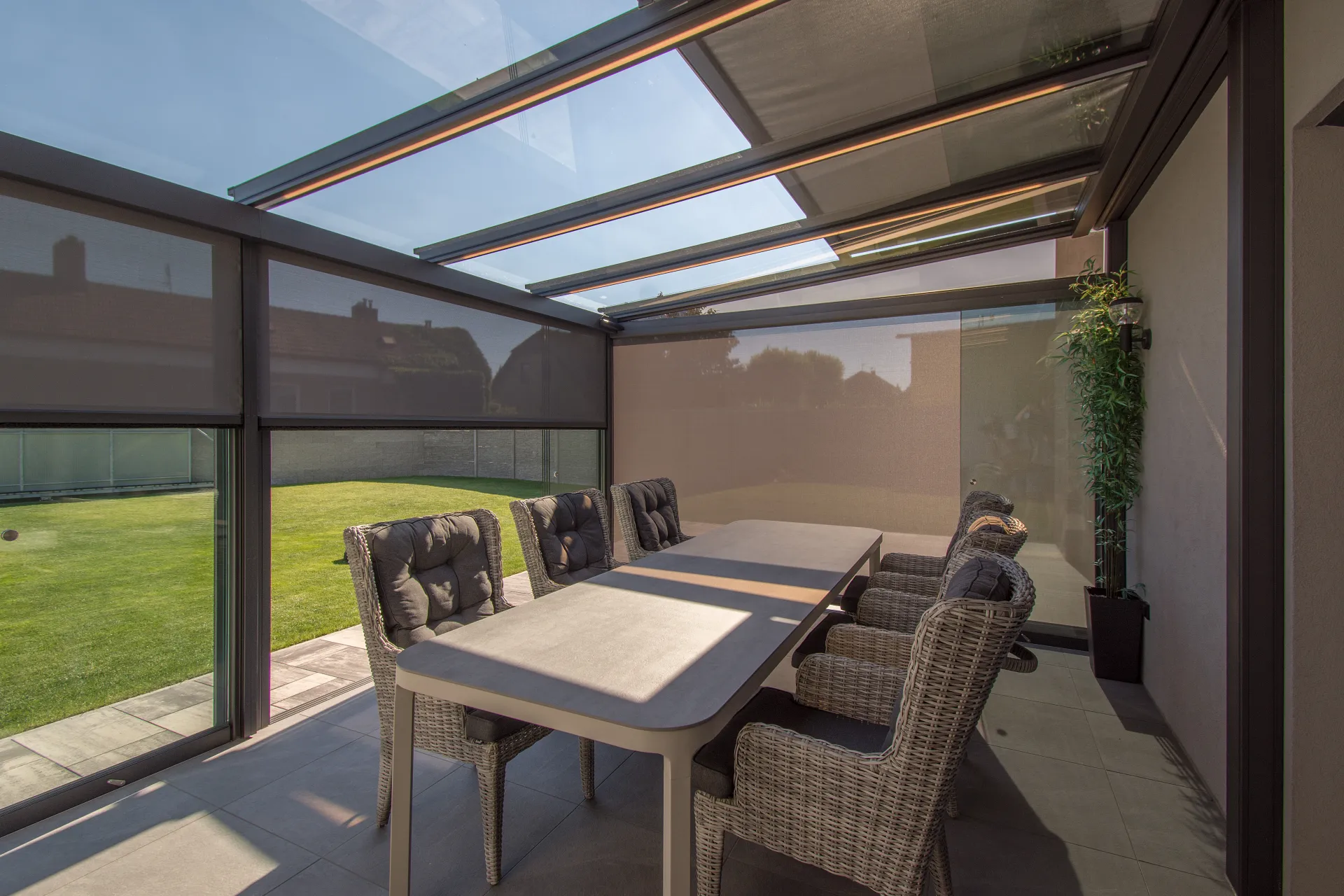 - screenové rolety plně integrovatelné do konstrukce, s vodicími lištami uvnitř konstrukce pro elegantní vzhled.