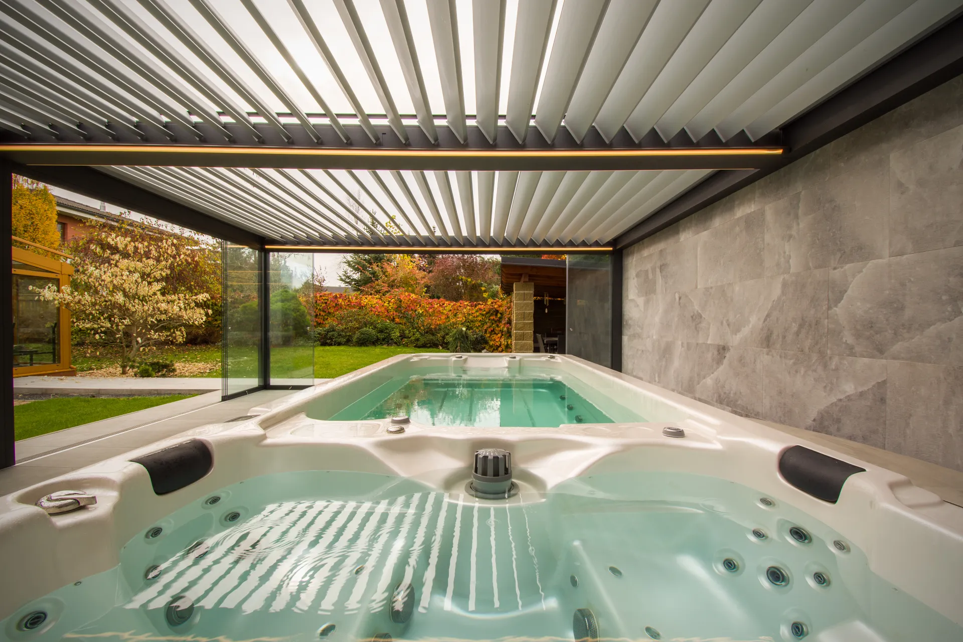 - kvalitní LED systémy integrované přímo do konstrukce pergoly,