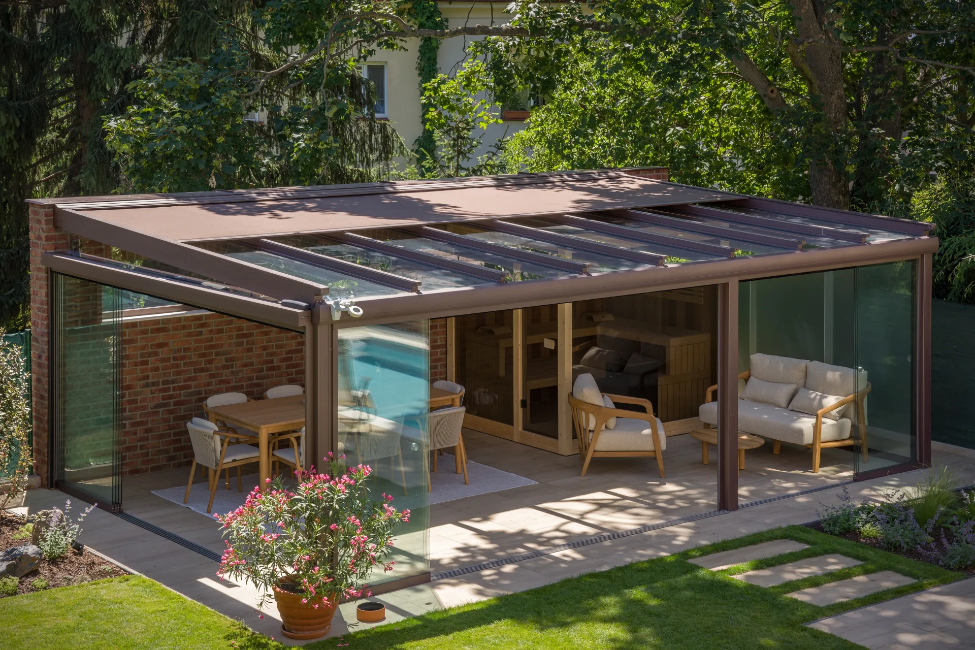 - integrované markýzy umístěné nad skleněnou střechou tvoří s pergolou jeden celek a jsou výrazně chráněné před větrem,